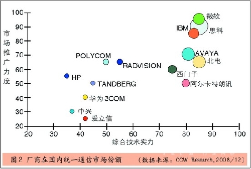 從當前國內(nèi)統(tǒng)一通信市場競爭格局來看,在綜合技術(shù)實力方面,根據(jù)廠商所提供的統(tǒng)一通信解決方案中所能夠提供的各種溝通方式融合的程度以及每個具體功能技術(shù)水平等綜合因素考慮,處于前幾位的分別是思科、微軟、北電、IBM和Avaya,它們的產(chǎn)品線比較長,產(chǎn)品功能也相對比較全面。