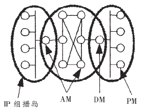 在采用混合式組播的IP視頻會議中,與會成員組成如圖1所示的拓?fù)浣Y(jié)構(gòu)。在每個IP組播島內(nèi),與會成員之間的數(shù)據(jù)傳輸使用IP組播,并選定一個與會成員作指定成員(Designate Member,DM),把島內(nèi)除DM外的與會成員稱為其他成員(Pertinent Member,PM),DM是島內(nèi)成員與島外成員之間通信的橋梁。島外成員與DM參加應(yīng)用層組播疊加網(wǎng)[5](包括一個控制拓?fù)浜鸵粋數(shù)據(jù)拓?fù)?的構(gòu)建,將其稱為應(yīng)用層組播成員(ALM Member,AM),AM之間的數(shù)據(jù)傳輸使用應(yīng)用層組播。IP組播島中PM通過DM與疊加網(wǎng)相連,DM與島外成員之間的數(shù)據(jù)傳輸采用應(yīng)用層組播方式,與島內(nèi)的成員之間的數(shù)據(jù)傳輸使用IP組播的方式。DM負(fù)責(zé)將來自疊加網(wǎng)的數(shù)據(jù)以IP組播方式傳送給組播島中PM,PM的數(shù)據(jù)也通過IP組播方式傳送到DM,由DM以應(yīng)用層組播的方式發(fā)送給疊加網(wǎng)上的其他與會成員。