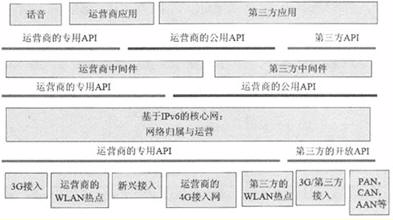 在某種意義上,下一代網(wǎng)絡(luò)必須是一種可編程的、基于IP的網(wǎng)絡(luò),這必然要求XG為應(yīng)用開發(fā)提供強(qiáng)大的、方便的、定義明確的API。對(duì)于一些業(yè)務(wù)提供商來說,API思想本身并非僅僅是一個(gè)基本概念。目前,公共API是指所有第三方都可用的API,它包括標(biāo)準(zhǔn)的、開放的API子集。另一方面,專用API是指由某個(gè)公司控制、僅僅在公司內(nèi)部或合作伙伴內(nèi)部可用的API。圖1給出了下一代網(wǎng)絡(luò)API體系結(jié)構(gòu)的一種高級(jí)分類方法。