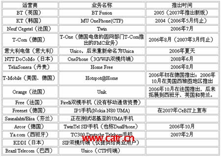 另外一個亮點是法國電信(Orange)于2008年11月底在Unik品牌下(Unik是Orange于2006年10月推出的FMC業(yè)務品牌,目前在法國已經(jīng)擁有100萬用戶)開通了高清移動電視業(yè)務,向法國用戶提供60多個高清移動電視頻道。該業(yè)務基于Orange于2008年9月開通的3G+UMA平臺,可實現(xiàn)WiFi網(wǎng)絡與3C網(wǎng)絡的平滑切換。該業(yè)務的推出,使FMC從最初的以話音業(yè)務為主擴展到視頻業(yè)務,基于融合性終端的業(yè)務越來越豐富,是FMC領域的一大進步(表1)。