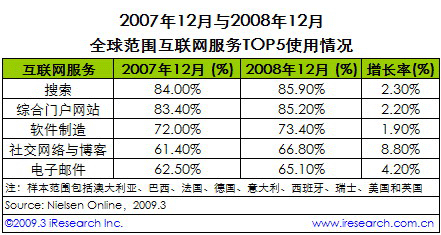 iResearch艾瑞咨詢根據(jù)NielsenOnline公布的全球范圍內(nèi)排名前五位的互聯(lián)網(wǎng)服務(wù)使用情況發(fā)現(xiàn),2008年在全球范圍內(nèi),社交網(wǎng)絡(luò)與博客的發(fā)展最為迅速。數(shù)據(jù)顯示,在包括搜索、綜合門戶網(wǎng)站、軟件制造、社交網(wǎng)絡(luò)與博客以及電子郵件在內(nèi)的五項(xiàng)互聯(lián)網(wǎng)服務(wù)中,相對2007年12月,2008年12月社交網(wǎng)絡(luò)與博客的使用情況增長率最高,達(dá)8.8%。而搜索、綜合門戶網(wǎng)站、軟件制造的增長率,分別為2.3%、2.2%、1.9%,均不足社交網(wǎng)絡(luò)與博客增長率的二分之一。高增長帶動社交網(wǎng)絡(luò)與博客服務(wù)在2008年12月以66.8%的使用率反超電子郵件(65.1%),躍居TOP5網(wǎng)絡(luò)服務(wù)第四位。