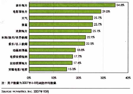 M:Metrics針對美國手機用戶的研究數(shù)據(jù)顯示,美國手機用戶在訂閱手機電視內容時偏愛娛樂類的內容,其中音樂短片、電影預告片是用戶需求最大的手機電視內容,另外受到歡迎的是與生活相關的內容及新聞內容。