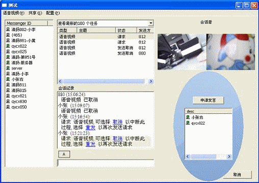 一、打開(kāi)對(duì)方的對(duì)話(huà)窗口,點(diǎn)擊[語(yǔ)音視頻]菜單,該語(yǔ)音通話(huà)的請(qǐng)求信息,將自動(dòng)出現(xiàn)在對(duì)方窗口,待對(duì)方確認(rèn)后自動(dòng)啟動(dòng)雙向語(yǔ)音對(duì)話(huà)。隨時(shí)可以在語(yǔ)音通話(huà)中點(diǎn)擊“取消“終止語(yǔ)音通話(huà)。