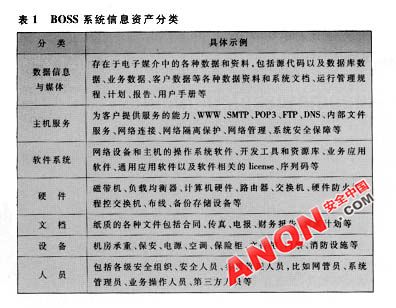 BOSS系統(tǒng)涉及的信息繁多,如何保護(hù)關(guān)鍵的數(shù)據(jù)不被泄漏是運(yùn)營(yíng)商非常重視的一個(gè)問(wèn)題。信息分級(jí)用來(lái)評(píng)估運(yùn)營(yíng)商是否建立了信息資產(chǎn)管理的規(guī)范,明確了信息資產(chǎn)的內(nèi)容和級(jí)別,制定了有效的安全保護(hù)措施,如果沒(méi)有,應(yīng)該明確BOSS系統(tǒng)內(nèi)的關(guān)鍵信息資產(chǎn)并列出清單,依據(jù)國(guó)家保密級(jí)別制定科學(xué)的信息資產(chǎn)分級(jí)標(biāo)準(zhǔn),并作為風(fēng)險(xiǎn)評(píng)估的依據(jù)。參照國(guó)際信息系統(tǒng)安全標(biāo)準(zhǔn)BS7799/ISO17799對(duì)信息資產(chǎn)的描述和定義,可以將BOSS系統(tǒng)信息資產(chǎn)按照表1的方法進(jìn)行分類(lèi)。