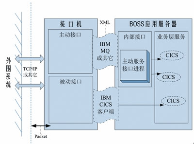 由圖1可知,從調(diào)用方向的角度看,接口可分為主動(dòng)接口和被動(dòng)接口,分別表示BOSS調(diào)用外圍系統(tǒng)服務(wù),以及外圍系統(tǒng)調(diào)用BOSS服務(wù)。主動(dòng)接口由BOSS應(yīng)用服務(wù)器驅(qū)動(dòng),即BOSS應(yīng)用服務(wù)器上的主動(dòng)服務(wù)接口進(jìn)程,是調(diào)用CICS對相關(guān)待處理表進(jìn)行輪詢,并將每一條記錄封裝為一條消息放入MQ隊(duì)列(該隊(duì)列均由消息組成),接口機(jī)上的主動(dòng)接口再從隊(duì)列中取出消息進(jìn)行解析,進(jìn)而根據(jù)控制信息發(fā)送到指定系統(tǒng)執(zhí)行。被動(dòng)接口則是由外圍系統(tǒng)驅(qū)動(dòng),通過接口機(jī)上的CICS客戶端調(diào)用BOSS應(yīng)用服務(wù)器上的業(yè)務(wù)層服務(wù)操作數(shù)據(jù)庫。
