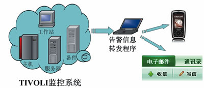 在具體實(shí)施上,為了形成統(tǒng)一的體系以方便監(jiān)控并達(dá)到告警信息與實(shí)時(shí)的反饋,可將以上4個(gè)層面因素納入IBM公司開發(fā)的TIVOLI監(jiān)控系統(tǒng)。除此之外,為實(shí)現(xiàn)告警信息的自動(dòng)推送與分發(fā),可將自行開發(fā)告警信息轉(zhuǎn)發(fā)程序接入TIVOLI監(jiān)控系統(tǒng)信息庫。一旦檢測到異常信息存在則立即進(jìn)行短信或郵件的發(fā)送,確保維護(hù)人員及時(shí)了解接口系統(tǒng)運(yùn)行情況。整個(gè)過程如圖2所示。