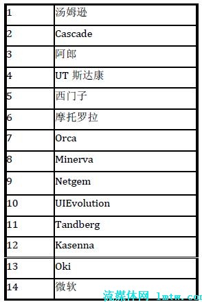 在中國市場上,UT 斯達(dá)康和中興公司暫時(shí)領(lǐng)先于其他公司。其中,UT 斯達(dá)康在海外也有不俗的表現(xiàn),如在印度和日本市場等;華為公司可以借助其整體解決方案的實(shí)力,有機(jī)會(huì)在下一代基于IMS 的IPTV 解決方案中脫穎而出。MRG 曾經(jīng)在2007 年3 月公布過一個(gè)市場調(diào)查,對(duì)IPTV 中間件及其市場影響力進(jìn)行了一個(gè)排名,具體的結(jié)果見表1。