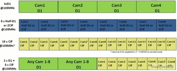 CX25838為監(jiān)控DVR設(shè)計人員提供機(jī)會,通過提供幀交錯數(shù)據(jù)實現(xiàn)編解碼器效率最大化,而不采用昂貴的FPGA或可編程邏輯。它還通過提供各種分辨率和幀速率,在一系列產(chǎn)品*享系統(tǒng)架構(gòu),提供規(guī)模優(yōu)勢的能力。例如,低成本DVR可采用一個編解碼器以全幀速率壓縮16個CIF分辨率通道,這可通過一條8位總線實現(xiàn)。其他解決方案可能需要每個編解碼器以全幀速率壓縮4個D1分辨率通道。還有些可能需要降低幀速率的D1