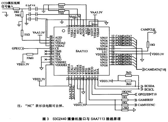 4:2:2格式。對SAA7113初始化需要通過I2C 總線進行,而S3C2440內部集成的I2C控制器正好可以實現這個過程。S3C2440的攝像機接口與SAA7113的連接原理如圖3所示。