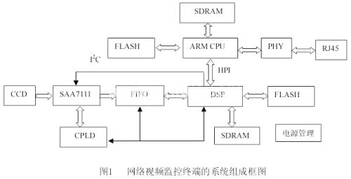 為實(shí)現(xiàn)視頻實(shí)時(shí)檢測(cè)以及網(wǎng)絡(luò)傳輸功能,本監(jiān)控終端采用ARM+DSP的體系框架,系統(tǒng)組成如圖1所示,主要包括以ARM S3C4510B為核心的主控兼網(wǎng)絡(luò)傳輸模塊,以SAA7111為核心的視頻采集模塊,以DSP