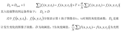敏感項(xiàng),α為抑制系數(shù),N為檢測(cè)區(qū)域內(nèi)的像素?cái)?shù)目。采用這種塊比較法,閾值取值范圍大大減小,易于確定,而且對(duì)運(yùn)動(dòng)目標(biāo)的大小也有一定的選擇性。在檢測(cè)每一子塊圖像是否發(fā)生變化時(shí),引入光照敏感項(xiàng),避免了因光照變化引起的虛警。這種方法對(duì)光線變化有一定的自適應(yīng)性,擴(kuò)展了系統(tǒng)的動(dòng)態(tài)適用范圍。