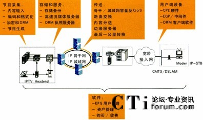 此外,為了提高對(duì)IPTV節(jié)目流點(diǎn)播的響應(yīng)和傳輸實(shí)時(shí)性,以及解決或減緩IPTV點(diǎn)播請(qǐng)求之沖擊性和波動(dòng)性對(duì)IPTV前端設(shè)計(jì)容量所造成的壓力,IP骨干網(wǎng)和IP城域網(wǎng)上普遍采用了內(nèi)容分送網(wǎng)絡(luò)技術(shù)。IP骨干網(wǎng)和IP城域網(wǎng)也可以采用不同的低層物理網(wǎng),以IP over SDH/SONET(即Packet over SDH/SONET),IP over ATM或IP over DWDM Optical(如千兆/萬兆光以太網(wǎng))的方式提供傳輸服務(wù)。有線電視前端或電信中心站則根據(jù)相應(yīng)的寬帶接入網(wǎng)絡(luò),如Cable Modem網(wǎng)絡(luò)或DSL網(wǎng)絡(luò)將IP視音頻流媒體節(jié)目流以IP over DOCSIS或IP over DSL的方式,通過放在有線電視前端的CMTS鑒定或電信中心站的DSLAM設(shè)備,向用戶發(fā)送出去。有線電視前端或電信中心站還往往配備有視音頻流媒體節(jié)目流內(nèi)容服務(wù)器和DRM授權(quán)/密鑰服務(wù)器,具有節(jié)目存儲(chǔ)和服務(wù)功能。   IPTV用戶終端設(shè)備被用來接收、存儲(chǔ)和播放及轉(zhuǎn)發(fā)IP視音頻流媒體節(jié)目;拘虸PTV用戶終端設(shè)備的硬件沒有內(nèi)置CableModem或DSLModem,它只提供一個(gè)以太網(wǎng)接口,與外部的CableModem,DSL Modem或以太網(wǎng)HUB相接。集成式的IPTV用戶終端設(shè)備則內(nèi)置Cable Modem或DSL Modem,可與Cable Modem或DSL寬帶網(wǎng)絡(luò)直接相連。高端IPTV用戶終端設(shè)備還帶有內(nèi)置硬盤,可以提供IPTV DVR功能,甚至支持IEEE802.11無線聯(lián)網(wǎng)功能,能將受DRM保護(hù)的IP視音頻流媒體節(jié)目通過無線傳輸給其他設(shè)備,如PC機(jī)等。一個(gè)IPTV用戶終端設(shè)備必須帶有IPTV系統(tǒng)所使用的DRM技術(shù)之客戶端軟件。為了使IPTV系統(tǒng)成為一個(gè)開放式的業(yè)務(wù)平臺(tái),IPTV用戶終端設(shè)備通常還使用了中間件軟件。EPG、用戶管理、媒體資產(chǎn)管理、收費(fèi)及各種應(yīng)用業(yè)務(wù)的相關(guān)軟件也是IPTV系統(tǒng)之必須具有的部件。