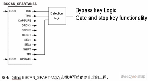 平臺中, 可在設(shè)計(jì)中使用BSCAN_SPARTAN3A宏模塊,其檢測邏輯可監(jiān)控FPGA構(gòu)造中的JTAG控制信號,如圖4所示。如果檢測到JTAG控制信號的活動,用戶在設(shè)計(jì)可以立即繞過關(guān)鍵邏輯或關(guān)斷關(guān)鍵功能,不再執(zhí)行正確的功能。這樣反向工程人員讀到的將是不正確的功能模塊,在不能完成預(yù)期功能的解決方案上浪費(fèi)時(shí)間和資源。