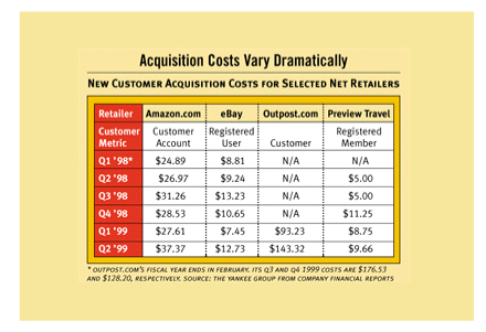 上世紀90年代末期DOT.COM就遭遇了這一嚴峻問題。70% - 80%的客戶在沒有完成采購之前就棄網(wǎng)站而去。對于許多人來說這被認為是一個“行業(yè)基準”,屬于可接受水平,但也有些人開始尋找解決方案。整個行業(yè)開始注意到分析家們的忠告:這一水平的放棄率是不被允許的。下面這張由Yankee集團在2000年發(fā)布的表格向我們展示了電子商務(wù)企業(yè)客戶獲取成本螺旋形盤升的過程。