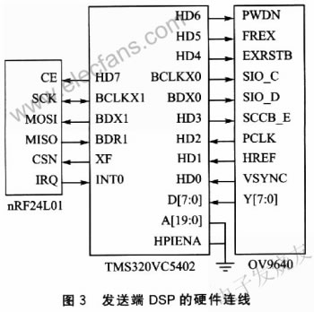 該芯片使用OmniVision公司自主開發(fā)的SCCB總線進(jìn)行控制,使用三線連接。其中SCCB_E為串口允許/禁止信號線,SIO_C和SIO_D分別為串口時鐘線和數(shù)據(jù)線。系統(tǒng)中僅對OV9640進(jìn)行控制而不需要獲知其狀態(tài),采用DSP的McBSPO端口進(jìn)行連接,其中HD3用于打開串口,BCLKX0和HDX0分別用于發(fā)送時鐘信號和控制數(shù)據(jù)。具體的硬件連線如圖3所示。
