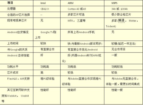 這三種處理器架構(gòu)各有優(yōu)缺點(diǎn),都希望成為未來(lái)Android互聯(lián)網(wǎng)電視(如果成功的話)的最主流平臺(tái)。那么哪一個(gè)處理器將最終勝出呢,答案只有留給時(shí)間來(lái)揭曉,我們不妨先來(lái)對(duì)這三個(gè)架構(gòu)進(jìn)行一番比較: