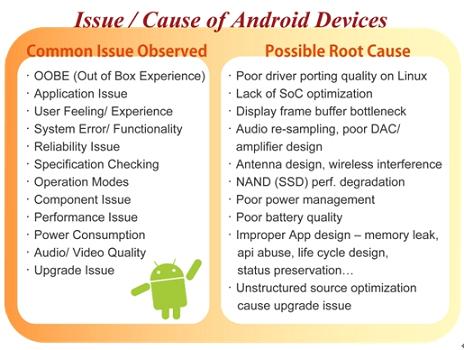 盡管Android系統(tǒng)的普及看似指日可待,但在實(shí)際的產(chǎn)品應(yīng)用上,也有其可能產(chǎn)生的問(wèn)題風(fēng)險(xiǎn)。Android作為一個(gè)開(kāi)放式的操作系統(tǒng),是Google提供廠商的操作系統(tǒng)參考架構(gòu)(reference design),廠商能有充足的發(fā)揮空間,以Android為基礎(chǔ)向上開(kāi)發(fā)設(shè)計(jì)自家產(chǎn)品,但也因?yàn)檫@樣的開(kāi)放性與自由性,讓廠商在軟硬件結(jié)合的這個(gè)環(huán)節(jié)必須下更大的功夫,像是如何挑選合適的硬件包括基頻處理器、通信芯片、觸控感應(yīng)芯片、天線與存儲(chǔ)器模組等,以及如何調(diào)整出最適當(dāng)?shù)能浖O(shè)定等,更重要的是如何將軟硬件整合,開(kāi)發(fā)出差異化的產(chǎn)品。這中間所有的細(xì)節(jié)都會(huì)對(duì)產(chǎn)品最終樣貌產(chǎn)生莫大的影響,像是其功能的完整度、使用接口的設(shè)計(jì)、效能表現(xiàn)(例如觸控滑動(dòng)畫(huà)面、開(kāi)啟程序所需時(shí)間)、品質(zhì)可靠度、甚至是后續(xù)的固件升級(jí)動(dòng)作等等。在此百佳泰便試圖以專業(yè)中立的測(cè)試實(shí)驗(yàn)室角度,來(lái)點(diǎn)出廠商應(yīng)用Android于手機(jī)、平板電腦或其他設(shè)備時(shí)應(yīng)注意的開(kāi)發(fā)重點(diǎn),以希冀作為一個(gè)有效的參考資訊。