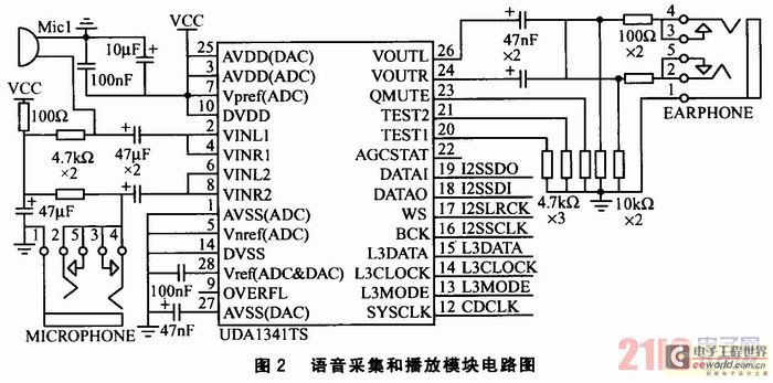 語音采集和播放模塊的作用是將音頻模擬信號轉換為數(shù)字信號,并對信號進行PCM編碼。其電路如圖2所示。采用Philips公司的UDA1341 TS型立體聲音頻CODEC進行音頻編解碼。該芯片提供2個麥克風輸入,可實現(xiàn)單端輸入、差分輸入等靈活配置,并設置了可編程增益放大器和自動增益控制器,可保證高質量的音頻獲取;同時,還集成了聽筒和喇叭輸出的驅動器,喇叭音量可以通過編程調整。S3C2440A-40微處理器與UDA1341TS編解碼器通過I2S總線直接相連,并采用DMA發(fā)送/接收方式,完成系統(tǒng)的錄音和放音。