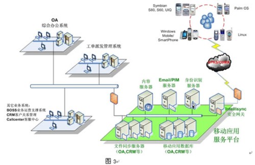 用戶通過(guò)智能手持終端訪問(wèn)應(yīng)用,平臺(tái)支持采用Symbian、SmartPhone、PocketPC和Palm操作系統(tǒng)的終端,還支持SyncML、brew、java、Windows PC的應(yīng)用。