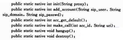 系統(tǒng)的主程序是一個標準的Android應用程序,它使用Java語言開發(fā),符合SDK規(guī)范。與一般的SDK程序不同的是,該類中必須使用Syst-em.loadLibrary加載PJSIP庫文件。形式如下:
