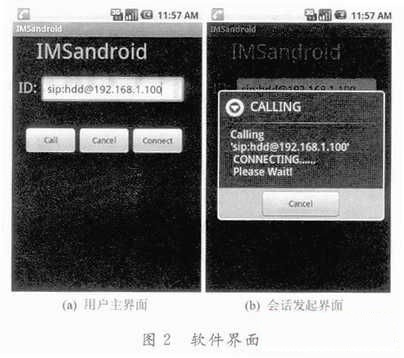 封裝后安裝到Android手機、MID或虛擬機中,并發(fā)起會話。與開源SIP軟件Linphone通信的結(jié)果如圖2所示。