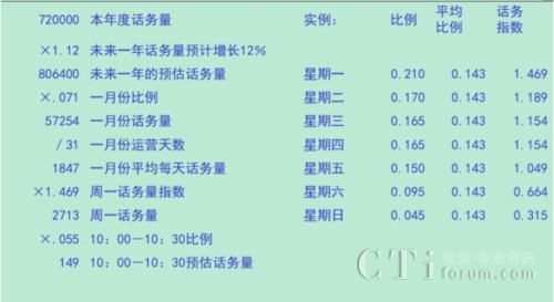 在上圖所示的比例分解過程中,我們假設(shè)去年的總來電量為720000個。在此基礎(chǔ)上,根據(jù)市場、銷售預(yù)測以及過去幾年歷史數(shù)據(jù)增長趨勢等數(shù)據(jù)測算出未來一年的話務(wù)量預(yù)計增長12%。這樣我們就得到了預(yù)計未來一年的總來電量為806400個。根據(jù)歷史數(shù)據(jù)的測算分析,一月份的來電量通常占全年總來電量的7.1%,因此明年一月份的來電量預(yù)計為57254個。由于呼叫中心是7X24小時運(yùn)營的,所以一月份平均每天的來電量為57254/31=1847個。由于大多數(shù)呼叫中心的來電量規(guī)律是以一周為周期循環(huán)波動的,因此我們接下來要測算四個(或五個)周一的話務(wù)指數(shù),以覆蓋四個或五個周一的來電量情況。我們用周一來電量占全周來電量的相對比例除以其七分之一的絕對比例,得出周一的來電量指數(shù)為1.469,也就是說,周一的來電量是相對較多的,相當(dāng)于一周日平均來電量的約147%。由此我們得出周一話務(wù)量為2713個。然后我們再根據(jù)由歷史數(shù)據(jù)測算出的周一一天中48個半小時時段占全天來電量的比例測算出周一上午10:00-10:30的來電量為149個。剩下的周二至周日都可以采用同樣的方法來推算預(yù)測。