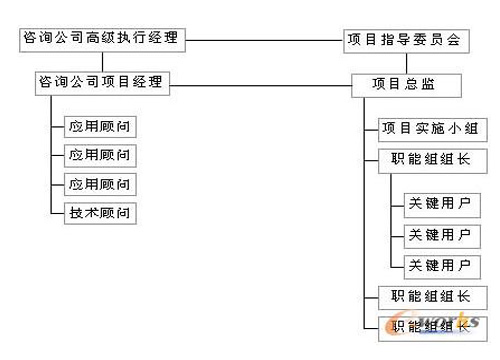 階段2:項(xiàng)目啟動(dòng) 這支隊(duì)伍既有企業(yè)高級(jí)管理層所組成的指導(dǎo)委員會(huì)和咨詢公司人員,也有來(lái)自信息部門的技術(shù)人員和相應(yīng)職能部門的熟悉企業(yè)流程的業(yè)務(wù)人員所組成的實(shí)施小組和職能小組。項(xiàng)目隊(duì)伍組織結(jié)構(gòu)如圖所示