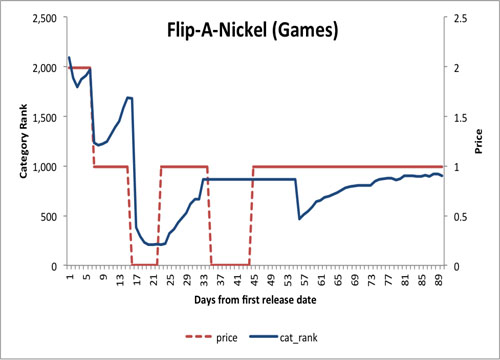 觀察那些熱門付費(fèi)應(yīng)用的運(yùn)營(yíng)策略,你會(huì)發(fā)現(xiàn)一個(gè)通行的做法——降價(jià)。降價(jià)的好處是使應(yīng)用的排名的快速上升。熱門付費(fèi)應(yīng)用在它們整個(gè)生命周期內(nèi)至少會(huì)降價(jià)一次。以上圖ASD公司開發(fā)的娛樂(lè)應(yīng)用FlipANickel為例,應(yīng)用發(fā)布時(shí)的價(jià)格為1.99美元。七天后,應(yīng)用降價(jià)至0.99美元的同時(shí)排名從2200飆升至229。