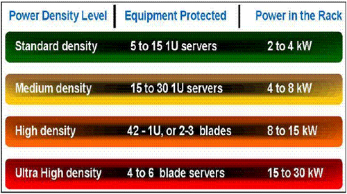當(dāng)企業(yè)部署刀片式服務(wù)器來(lái)宿主其虛擬服務(wù)器時(shí)尤其如此。刀片式服務(wù)器采用多個(gè)即插即用型處理裝置,它們共享公共的電氣系統(tǒng)、電源、風(fēng)扇、電纜和存儲(chǔ)器。這樣的安排節(jié)省了數(shù)據(jù)中心的占地面積,簡(jiǎn)化了硬件管理,并提高了IT靈活性。然而,這同時(shí)也大大增加了運(yùn)算密度。結(jié)果,刀片式服務(wù)器產(chǎn)生大量的熱,從根本提高了機(jī)柜級(jí)供電要求。確實(shí),一個(gè)典型的傳統(tǒng)服務(wù)器機(jī)柜可能需要4至6 kW電力,而一個(gè)典型的布滿(mǎn)刀片式機(jī)架的機(jī)柜則可能需要高達(dá)30 kW的電力,遠(yuǎn)遠(yuǎn)超過(guò)許多電源和冷卻系統(tǒng)的處理能力。