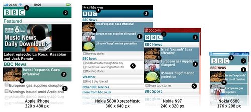 BBC還可以為特定的設(shè)備(或是一組設(shè)備)重新編排一些內(nèi)容。iPhone有非常豐富的功能,因此iPhone版的BBC還有音樂下載選項(xiàng),而其他的設(shè)備可能只會(huì)顯示今天最熱門的‘BBC新聞’?梢愿鶕(jù)數(shù)據(jù)的大小,多媒體的處理能力甚至是屏幕的尺寸決定是否需要針對(duì)iPhone提供更加豐富的內(nèi)容。以Nokia 6680上的‘特色’顯示為例,它大部分的顯示內(nèi)容是讓用戶滾動(dòng)屏幕查看今天最熱門新聞故事。iPhone上顯示了三個(gè)新聞故事,而其中只有一篇配有插入。這使得用戶無需滾動(dòng)屏幕就可以大致了解全部的咨詢。