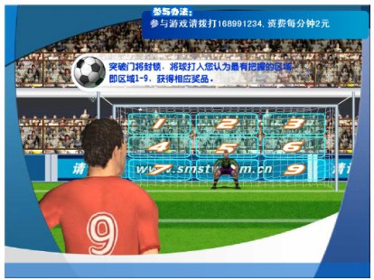 《單挑足球射門II》是我公司根據(jù)世界杯的一些特點(diǎn)、特色重新開發(fā)的一款實(shí)時(shí)游戲。由電視臺(tái)、網(wǎng)站與電信運(yùn)營(yíng)商聯(lián)合經(jīng)營(yíng)的電信增值業(yè)務(wù),由電視臺(tái)提供頻道向電視觀眾播出游戲畫面(含圖像和聲音),電信運(yùn)營(yíng)商提供電話線路和短信通道,參與者通過固定電話、小靈通和手機(jī)參與游戲,運(yùn)營(yíng)方通過收取固定電話、小靈通和手機(jī)的信息費(fèi)實(shí)現(xiàn)盈利。