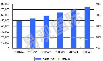 2006年第1季度中國即時(shí)通訊注冊賬戶規(guī)模達(dá)到7.4657億,相比2005年第4季度增長7.8%,為5個(gè)季度來最低。