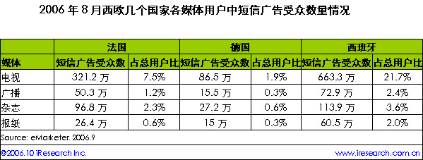 iResearch艾瑞市場咨詢根據(jù)eMarketer資料整理顯示,短信廣告在西歐國家大行其道,成百上千萬的移動(dòng)用戶訂閱了廣告短信。西歐各國不同媒體訂閱廣告短信的用戶數(shù)不盡相同。總體上來看,西班牙的短信廣告受眾最多,電視用戶中有21.7%人訂閱了短信廣告,數(shù)量達(dá)663.3萬。相比之下,法國電視用戶中的短信廣告受眾只有西班牙的1/2,德國則更少。