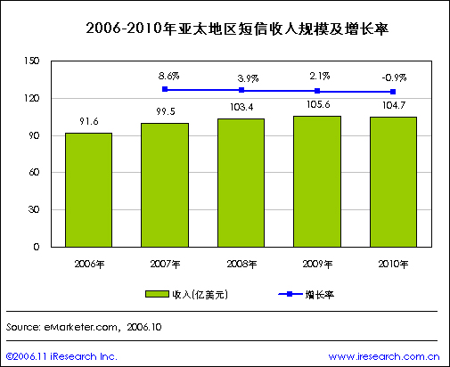 iResearch艾瑞市場咨詢整理eMarketer的相關數據顯示,2006年亞太地區(qū)短信收入將達到91.6億美元,2007年預計短信收入為99.5億美元,比2006年增長8.6%,2008年短信收入將達到103.4億美元,比2007年增長3.9%;2009年的短信收入預計為105.6億美元。預計到2010年亞太地區(qū)短信收入將達到104.9億美元,比2009年增長2.1%.