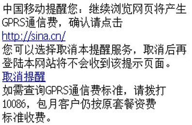 從2007年5月17日起,通過手機(jī)訪問WAP網(wǎng)站,中國移動(dòng)向用戶主動(dòng)提供一個(gè)收費(fèi)提示頁面,提醒用戶“正在使用手機(jī)上網(wǎng)業(yè)務(wù),若繼續(xù)瀏覽網(wǎng)頁,將會(huì)產(chǎn)生GPRS通信費(fèi)”。但打開中國移動(dòng)夢網(wǎng)頁面,則不會(huì)有上述提示。