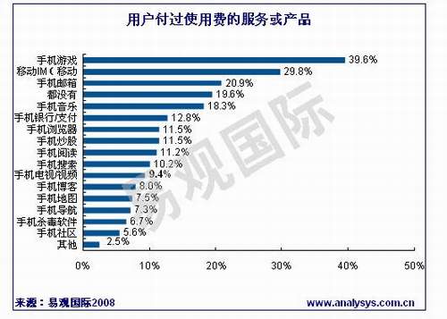 據(jù)易觀國際《中國手機應(yīng)用市場用戶調(diào)研報告2008》研究發(fā)現(xiàn),用戶付過使用費的手機應(yīng)用服務(wù)及產(chǎn)品中,手機游戲、移動IM和手機郵箱的比例較高。其中39.6%的手機應(yīng)用用戶付費玩過手機游戲,29.8%的用戶曾經(jīng)為移動IM付費,而手機郵箱的付費用戶將達20%。其他手機應(yīng)用產(chǎn)品或服務(wù)中,付費用戶的比例相當,均在10%左右,但是有近20%的用戶沒有用過任何的付費服務(wù)或產(chǎn)品。