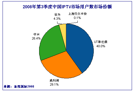 根據(jù)易觀(guān)國(guó)際(Analysys International)的研究顯示,2008年第3季度廠(chǎng)商的競(jìng)爭(zhēng)格局方面沒(méi)有顯著變化,中國(guó)IPTV市場(chǎng)主要廠(chǎng)商情況如下:
