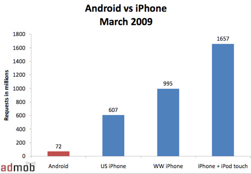 不過,Android仍在iPhone面前相形見絀。根據(jù)AdMob的數(shù)據(jù),在美國市場上,Android3月的廣告索閱量為7200萬,iPhone為6.07億;全球市場上,iPhone為9.95億,加上iPodTouch為16.6億。