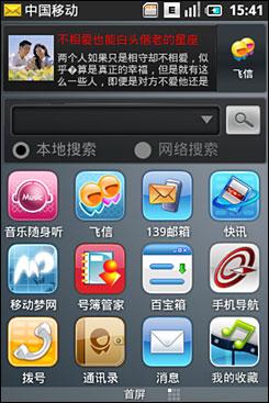 在第一屏的上端,是中國移動(dòng)的“快訊”欄目條和飛信登錄框,這讓整個(gè)手機(jī)看上去極具“中國移動(dòng)特色”,“快訊”和“飛信”的下面是Google的搜索框,搜索框有兩個(gè)選擇,分別是本地搜索和網(wǎng)路搜索。