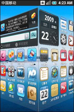 由于OMS是在基于Linux的Andriod系統(tǒng)基礎(chǔ)上,針對(duì)中國市場(chǎng)需求以及中國移動(dòng)的自有業(yè)務(wù)所做的修改,OMS操作系統(tǒng)看上去第一直觀感受仍然是與iPhone界面和T-Mobile推出的第一款A(yù)ndriod手機(jī)“Gphone”界面非常相似。