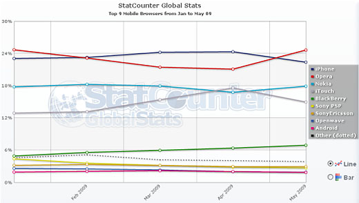 根據(jù)StatCounter的統(tǒng)計數(shù)字,Opera的移動瀏覽器在5月幾乎完全從2009年一到四月每月穩(wěn)定下降三個百分比的低潮中恢復(fù)過來了。StatCounter在1月特別點出 Opera在移動瀏覽市場的占有24.69%,比這個月高出0.05%。不論這個月的使用數(shù)字到底為何,至少數(shù)字回升了,這無疑是Opera值得驕傲的事。