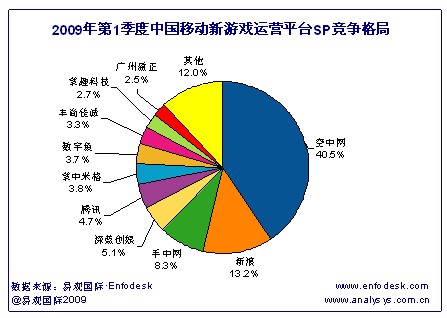 目前與新游戲平臺合作的SP包括空中網(wǎng)、騰訊、掌上明珠、TOM等在內(nèi)的共30家左右,在線游戲數(shù)量達80多款,從SP在新平臺的市場表現(xiàn)來看(具體見下圖):空中網(wǎng)占據(jù)中國移動新平臺信息費收入40.5%的份額,這促使空中網(wǎng)在手機游戲市場占據(jù)第一名的位置,目前空中網(wǎng)在新游戲平臺投放的手機游戲主要有周星星功夫臺球、異三國Online、天劫Online、功夫(周星馳大片)等,其中手機網(wǎng)游“天劫Online”的用戶歡迎度尤其突出。手機網(wǎng)游產(chǎn)品中深藍創(chuàng)娛的“深藍棋牌樂園之斗地主”、掌上明珠的“幻想i時代”、廣州盈正的“文明OL”等均有不錯表現(xiàn)。因此用戶對手機網(wǎng)游產(chǎn)品的高關注度也肯定了了新游戲平臺推出的必要性。