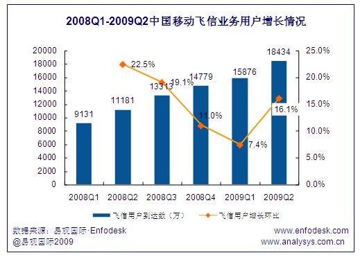 截至2009年第2季度,中國移動飛信用戶到達數(shù)達1.84億,環(huán)比增長16.1%,與2008年第2季度的1.12億用戶到達數(shù)相比同比增長64.9%,可見飛信用戶規(guī)模增長的速度十分迅速,究其原因一方面在于飛信運營商不遺余力的多渠道營銷宣傳,另一方面在于飛信用戶的口碑傳播,由于用戶規(guī)模的增長帶來更多用戶嘗試體驗飛信業(yè)務(wù)。