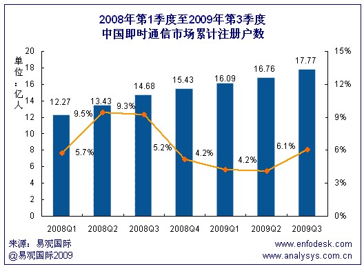 根據(jù)易觀國際Enfodesk產(chǎn)業(yè)數(shù)據(jù)庫即將發(fā)布的《2009年第3季度中國即時通信市場季度監(jiān)測》數(shù)據(jù)顯示,2009年第3季度中國即時通訊市場累計注冊賬戶數(shù)達(dá)到17.77億,環(huán)比增長6.1%,同比增長21%。