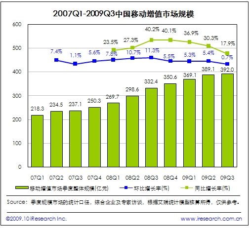 2009Q3中國(guó)移動(dòng)增值市場(chǎng)規(guī)模達(dá)392.0億元,同比增長(zhǎng)17.9%,環(huán)比增長(zhǎng)0.7%。