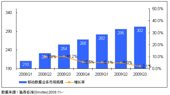 馳昂咨詢(xún)(Sinotes)發(fā)布的《2009年中國(guó)移動(dòng)數(shù)據(jù)業(yè)務(wù)市場(chǎng)監(jiān)測(cè)-第三季度》報(bào)告數(shù)據(jù)顯示,2009年Q3中國(guó)移動(dòng)數(shù)據(jù)業(yè)務(wù)市場(chǎng)規(guī)模達(dá)302億元,相比2009年Q2增長(zhǎng)2.1%,表現(xiàn)出了平穩(wěn)增長(zhǎng)的態(tài)勢(shì)。