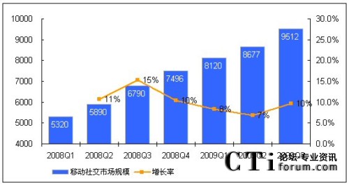 CTI論壇(ctiforum)12月8日消息(記者 楊悅):馳昂咨詢(Sinotes)發(fā)布的《2009年中國移動互聯(lián)網(wǎng)業(yè)務(wù)市場監(jiān)測-第三季度》報告數(shù)據(jù)顯示,2009年Q3中國移動社交業(yè)務(wù)市場規(guī)模才超過9000萬元,達9512萬元,直逼億元大關(guān)。與2009年Q2相比,增長率達10%。預(yù)計其年增長率將超過30%。