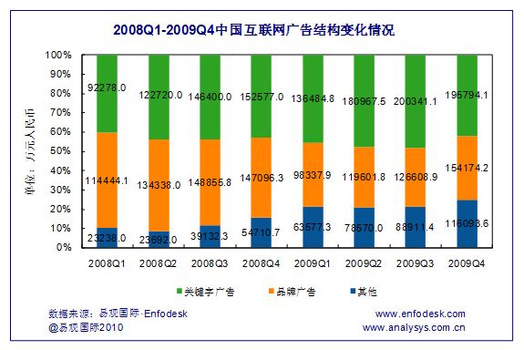品牌廣告則繼續(xù)保持上升趨勢,2009年第4季度,其市場規(guī)模達到15.4億元,環(huán)比增長21.8%,同比小幅上升4.8%。增長來源主要是快消品、互聯(lián)網(wǎng)產(chǎn)品及服務以及汽車、通訊行業(yè)等。