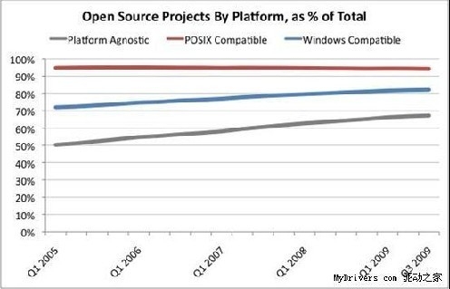 而在四年半之前的2005年第一季度,還只有72%的開源軟件與Windows系統(tǒng)兼容。另外,POSIX(可移植操作系統(tǒng)接口)兼容的開源軟件比