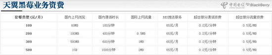 目前電信推出的黑莓手機(jī)套餐分為四類,一類為天翼黑莓簡裝版,價格為每月189元,包括60MB國內(nèi)上網(wǎng)流量,100分鐘國內(nèi)語音通話時長;第二類是天翼黑莓標(biāo)準(zhǔn)版套餐,價格為289元,包括100MB國內(nèi)上網(wǎng)流量,0.5MB國際上網(wǎng)流量,400分鐘國內(nèi)語音通話時長;第三類和第四類為天翼尊享版套餐包括389元和589元兩種資費(fèi),前者包括500MB國內(nèi)上網(wǎng)流量,1MB國際上網(wǎng)流量,600分鐘國內(nèi)語音通話時長;后者包括1GB國內(nèi)上網(wǎng)流量,2MB國際上網(wǎng)流量,1000分鐘國內(nèi)語音通話時長。